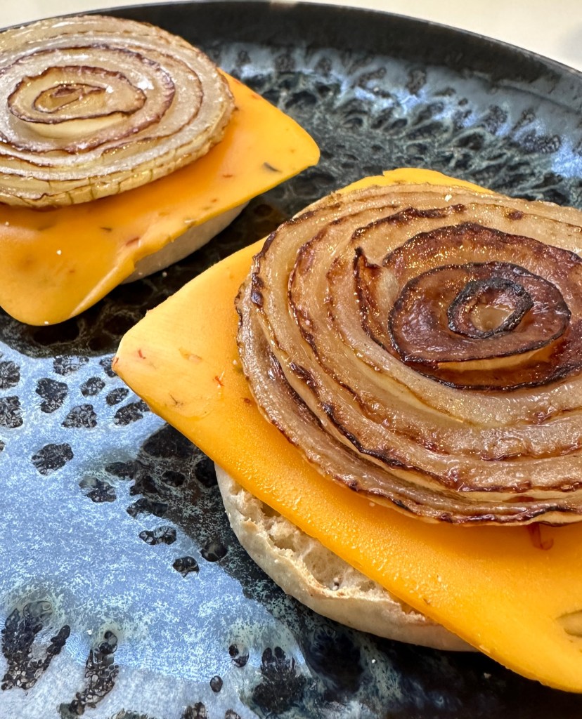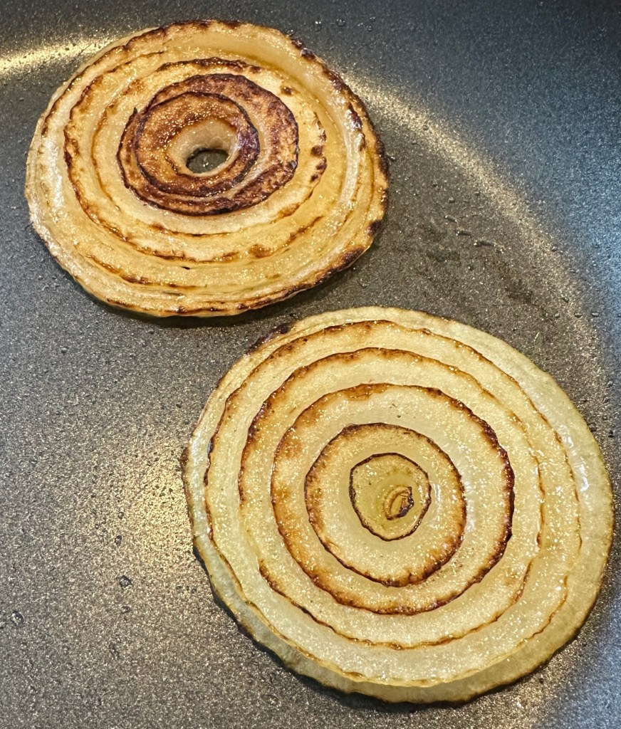 Slice your onions and brown them up nicely. Keep them generally together while browning, this provides a better finished product in the sammie. You want a medium low temp and use a neutral oil such as avocado. While your onions are caramelizing take your eggs out of the fridge