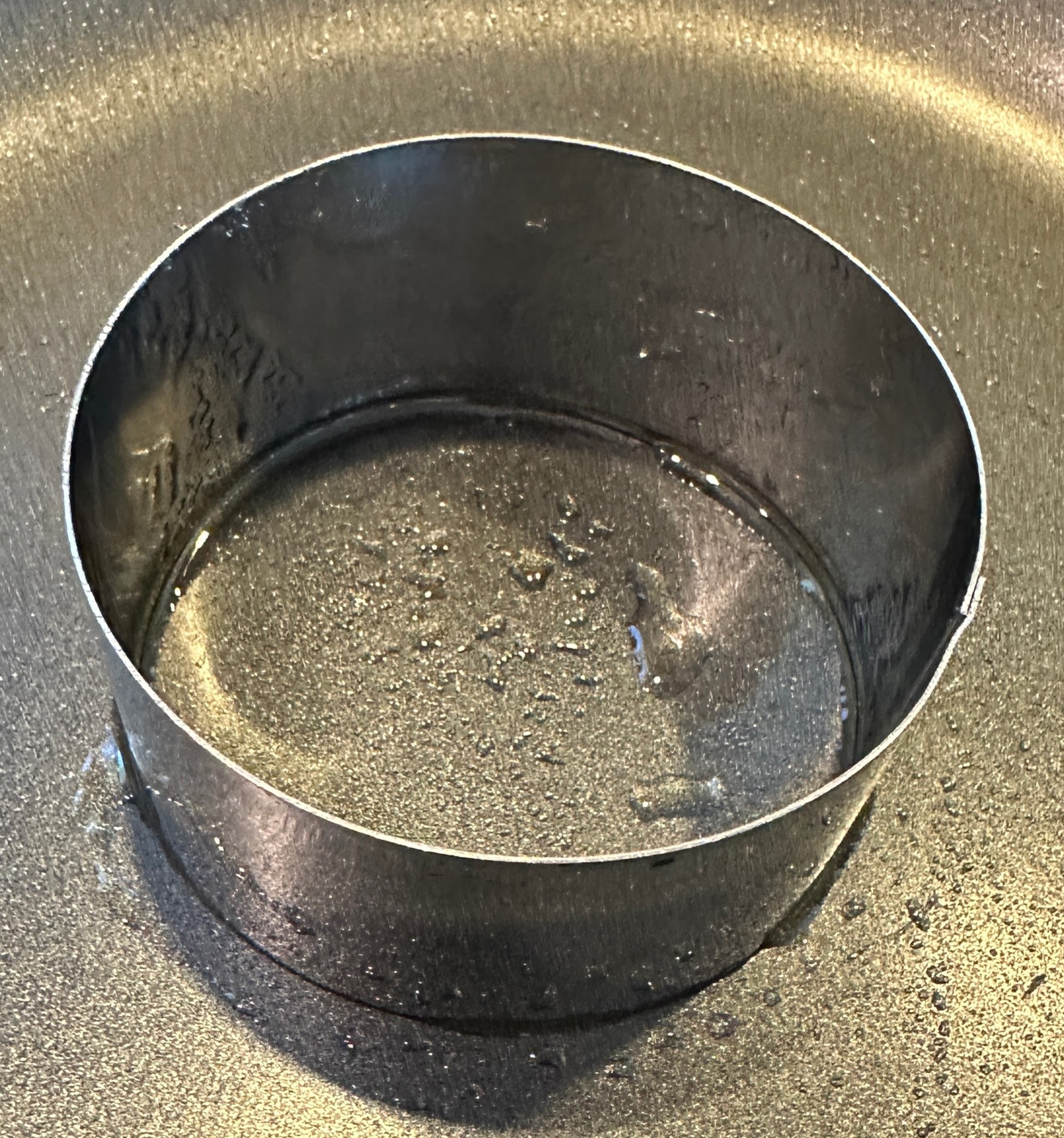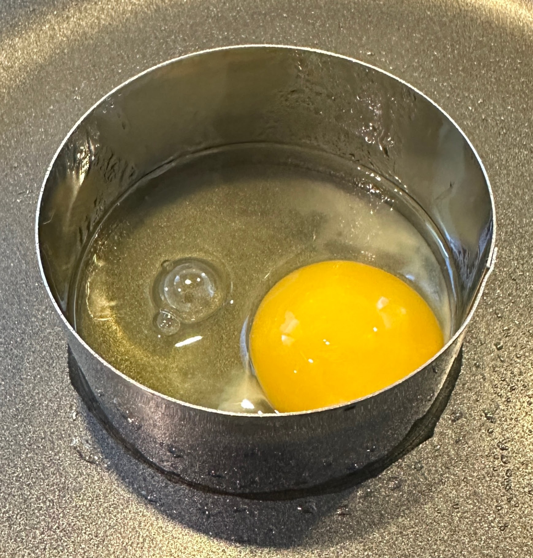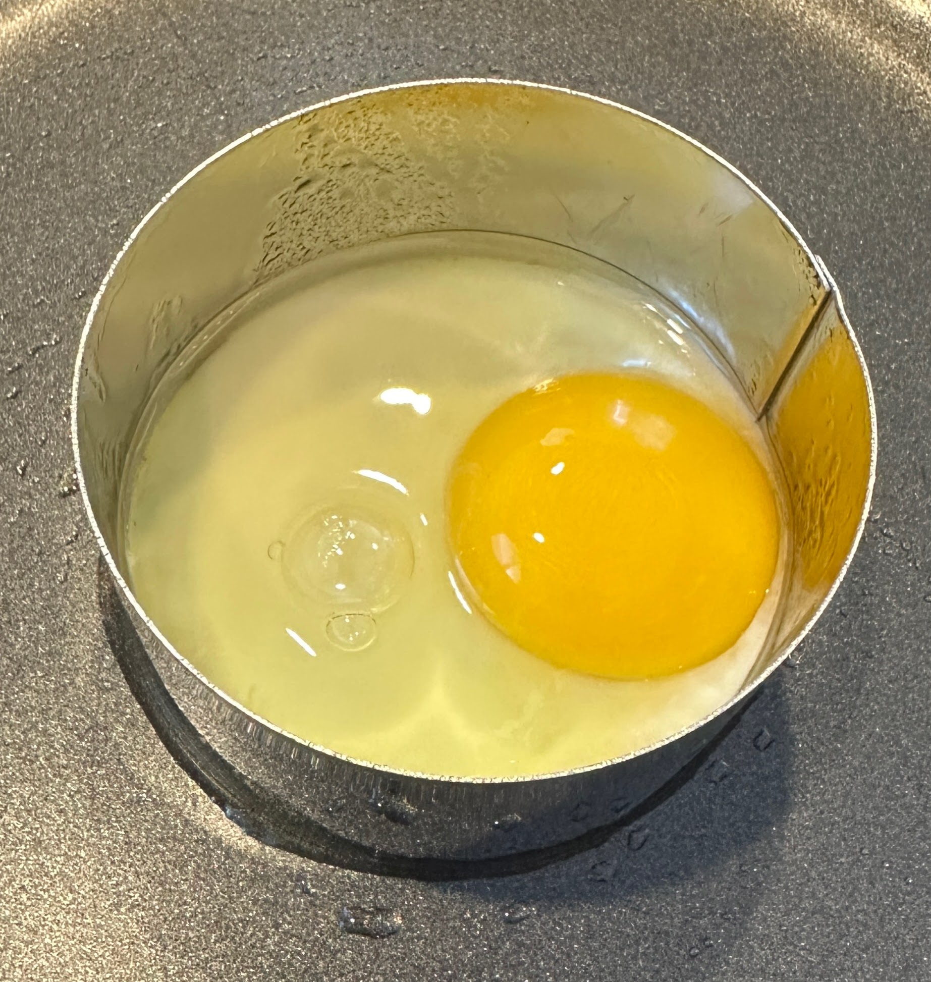 When I’m making a breakfast sammie I like to use a circle mold to crack the egg into so they have a more consistent shape. This also raises the yolk up onto the egg white so you’re more likely to get a runnier yolk.